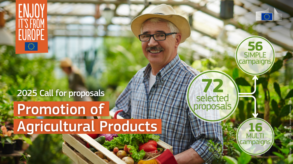 Η Κομισιόν γνωστοποίησε ότι έχει επιλέξει για χρηματοδότηση 72 διαφημιστικές εκστρατείες για την ανάδειξη της ποιότητας των ευρωπαϊκών γεωργικών προϊόντων, οι οποίες αναμένεται να ενισχύσουν την ανταγωνιστικότητα του κλάδου αγροδιατροφικών προϊόντων της ΕΕ.